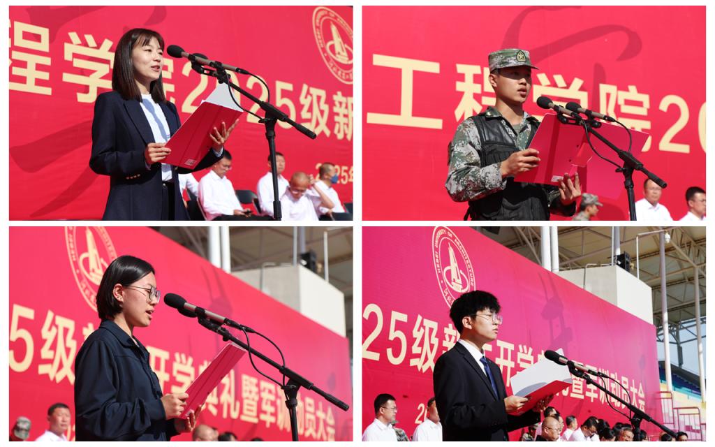 教师代表电气工程学院史丽莎、新生代表土木工程学院研究生陈伟、军训教官代表能源工程系马驰骋、参训学生代表建筑与艺术学院吕佳乐依次进行发言。