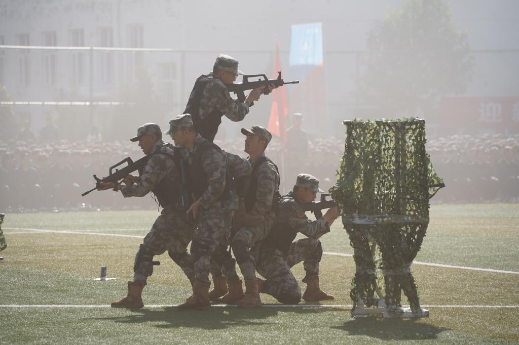 军训教官在现场进行队列、花枪和战术示范表演,他们军容严整、配合严密,生动呈现了我校军训教官矢志打赢的精神风貌和能攻善守的过硬本领,为在场师生带来一场别开生面的国防教育课。