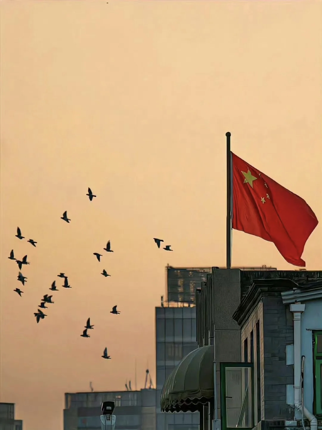 晚霞为幕,中国红旗帜在城市天际飘扬,群鸟翩跹相伴,那抹红是和平的底色,更是家国兴盛的生动注脚。