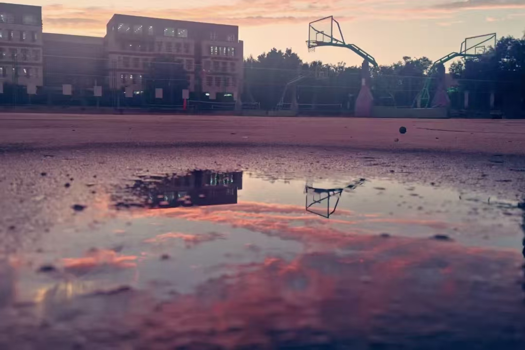 暮色里,建院紫晕染球场与楼宇,水洼如镜,将晚霞、建筑与球架的轮廓温柔复刻,每一处光影都是建院独有的诗意注脚。