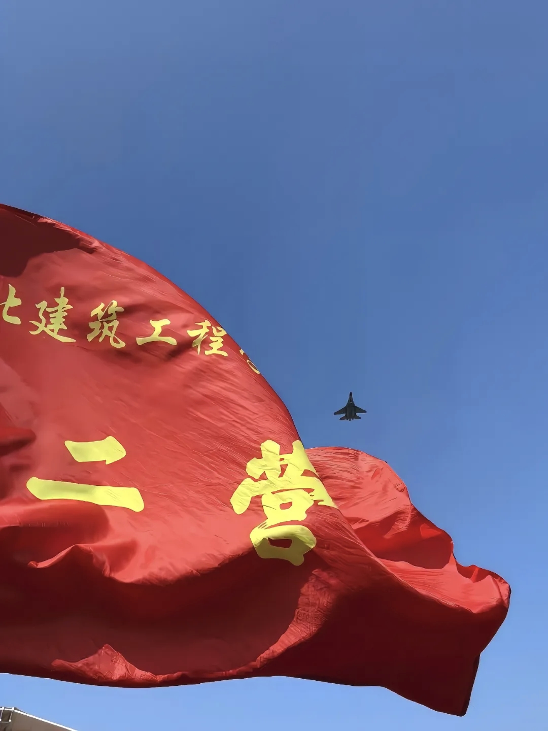 在蓝天的见证下,建筑人的旗帜与战鹰同框,一砖一瓦筑就城市筋骨,一飞冲天守护家国长空,不同的战场,同样的赤诚担当!那抹炽热的红,是青春担当,更是家国情怀的铿锵绽放!