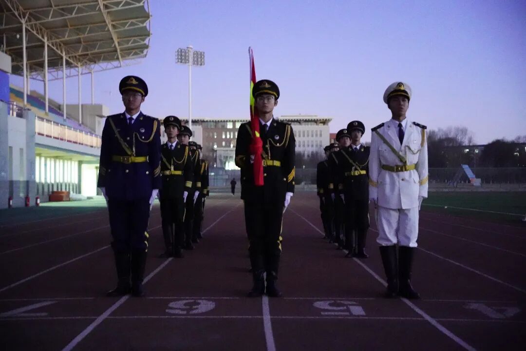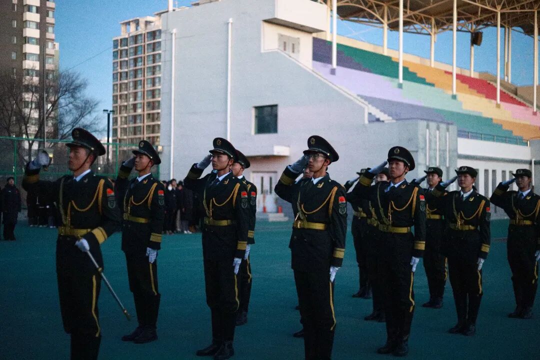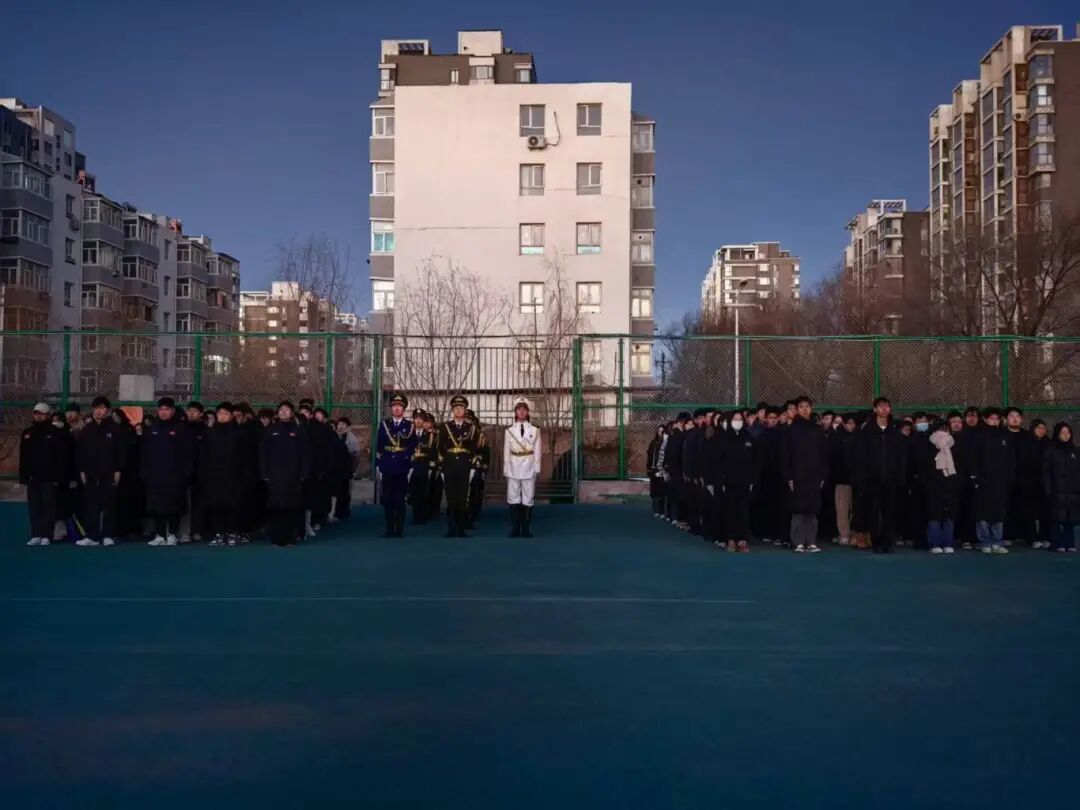 随着国歌声响起,五星红旗在凛冽寒风中冉冉升起。全体同学肃立,心怀敬意,向着国旗行注目礼,表达悼念。